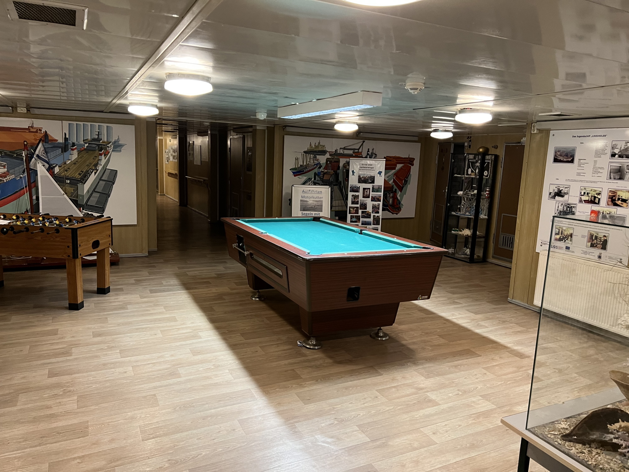 Gruppenräume mit SAT-TV, Video, Disco-Anlage, Klub- und Seminarraum, Saal für 100 Personen, Maritim- / Kreativ-Kabinett, Seminarraum mit Internetzugang, Spiel- und Bolzplatz mit diversen Spiel- und Sportgeräten für draußen vor dem Schiff, Billard, Tischtennis, Klubraum mit Kicker, Darts, Sitzecke und vielen kleinen Spielen in Begleitung eines Betreuers, Grillplatz vor dem Schiff, vereinseigene Flotte (Ruder-, Segel-, Motorboote), kleines Kioskangebot (Snacks, Ansichtskarten), Kreativangebote (z.B. Gipsfiguren, Knoten, Collagen & Piratentag u.v.m.) (teilweise gegen Gebühr)