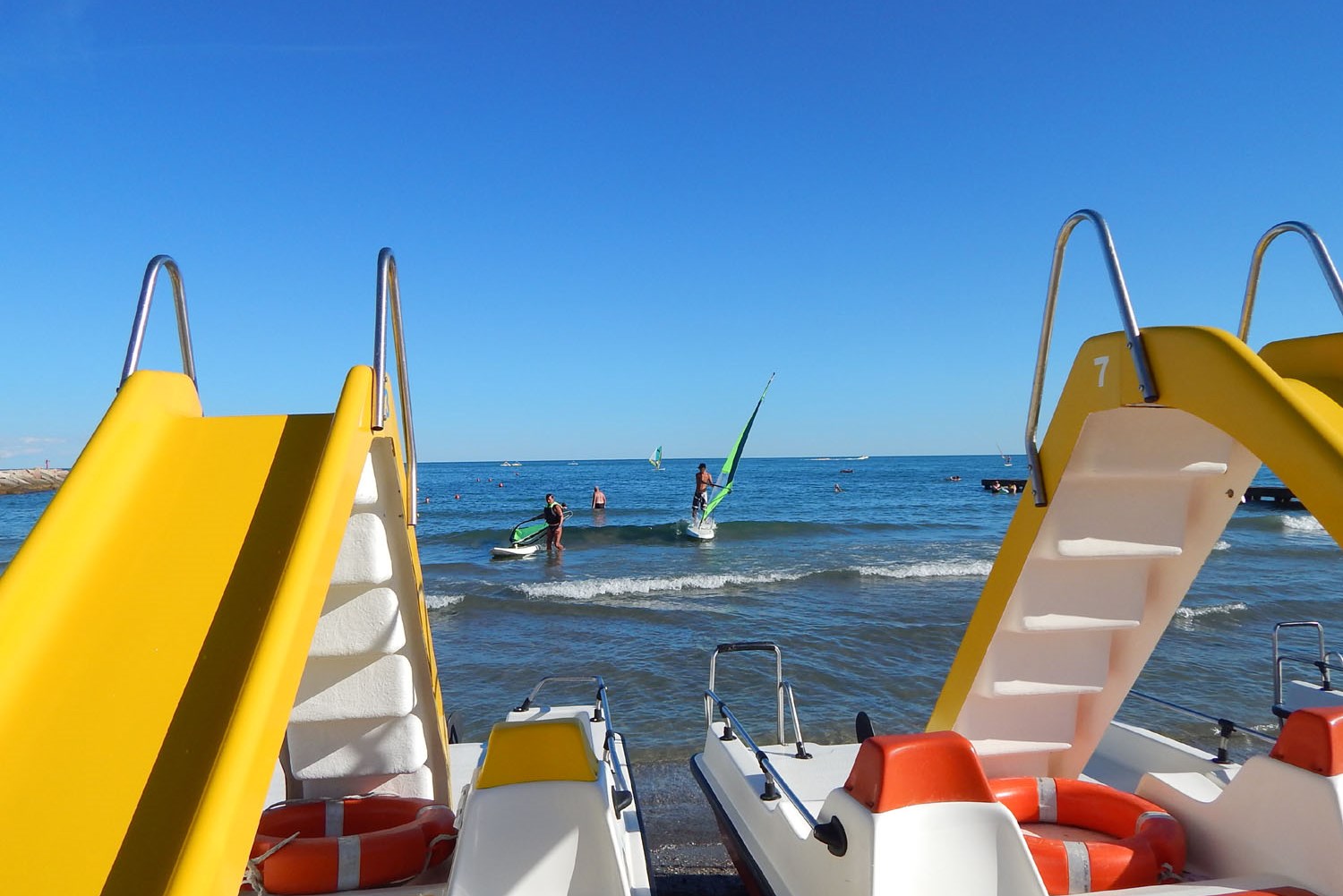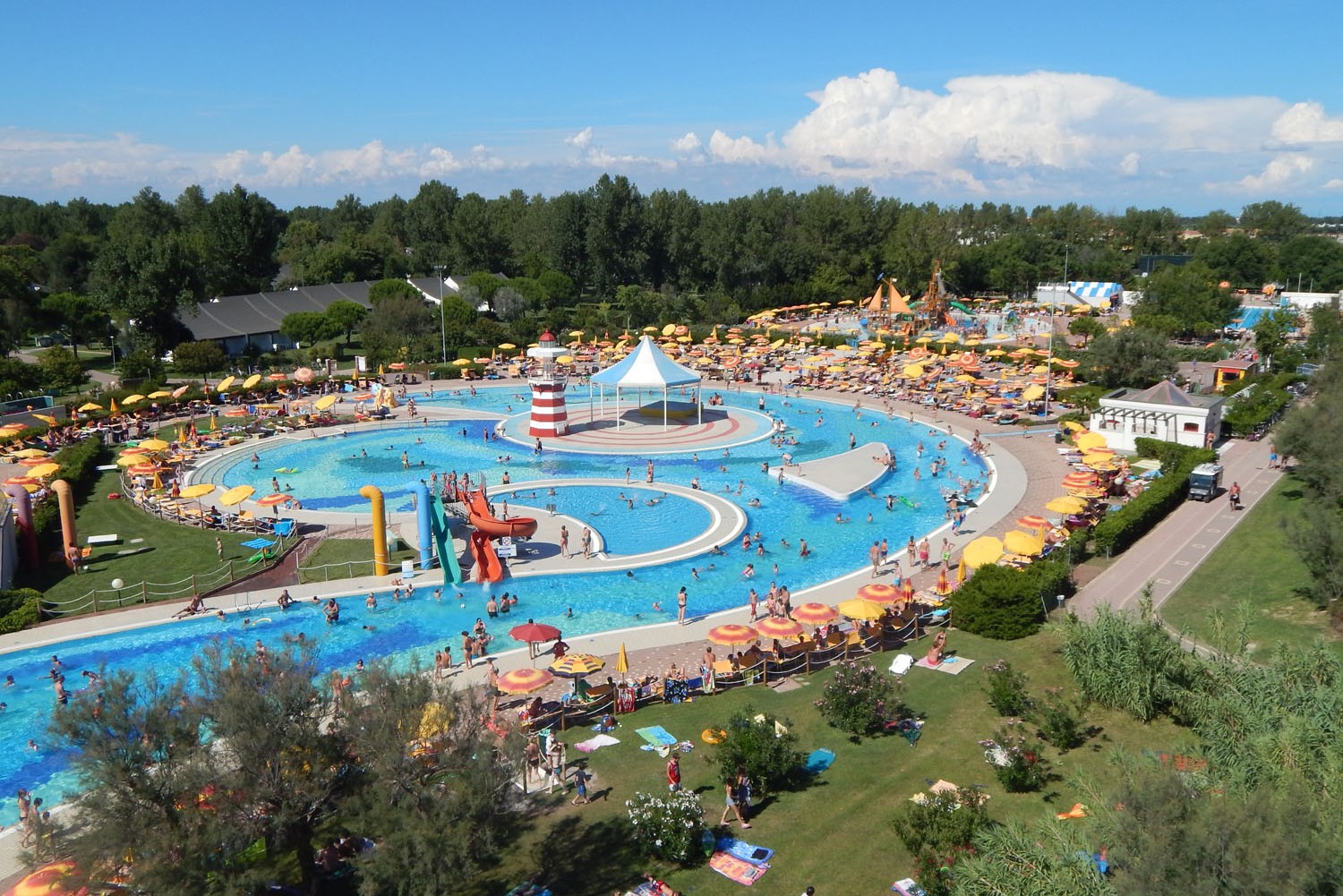 großer Wasserpark mit Riesenrutsche, weitläufiger Privatstrand (beides bewacht), Beachvolleyballfelder, Beach-Soccer, Beach-Tennis, verschiedene Ballsportplätze, Bogenschießplatz, Sonnenschirm-, Tretboot- und Fahrradverleih, Fitnesspfad, Restaurant, Pizzeria, Eisdiele, Bar, Disco, Supermarkt, WLAN & nächtlicher Wachdienst
